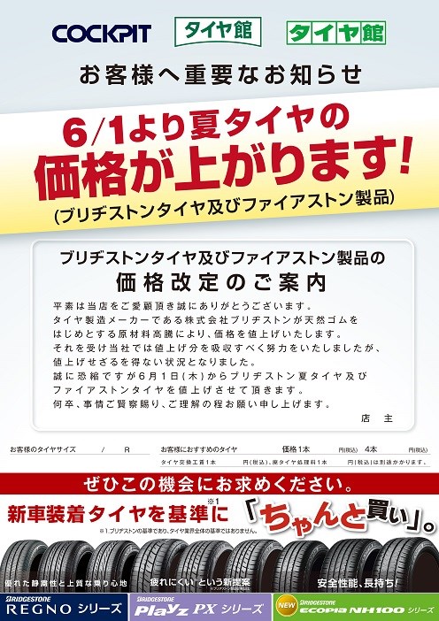 今日が最終日 ポスト 2017年5月31日 みなさんこんにちは。 タイヤの値上げが明日に迫ってまいりました;;; お得に交換できるのは今日が最後です! 交換時期が近付いているタイヤはもちろん! 交換した方がいいのか分からない!! 交換するのを迷っている!! うちのタイヤは交換時期なの?? という方はぜひタイヤ館真岡にお越しください! みなさんのタイヤをしっかりと点検させていただきます。 夜7時までの営業となっておりますので、ぜひお越しください^^