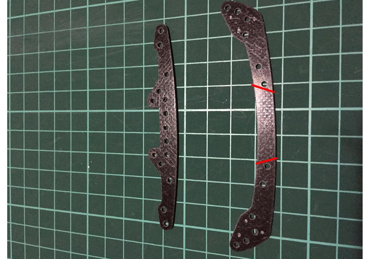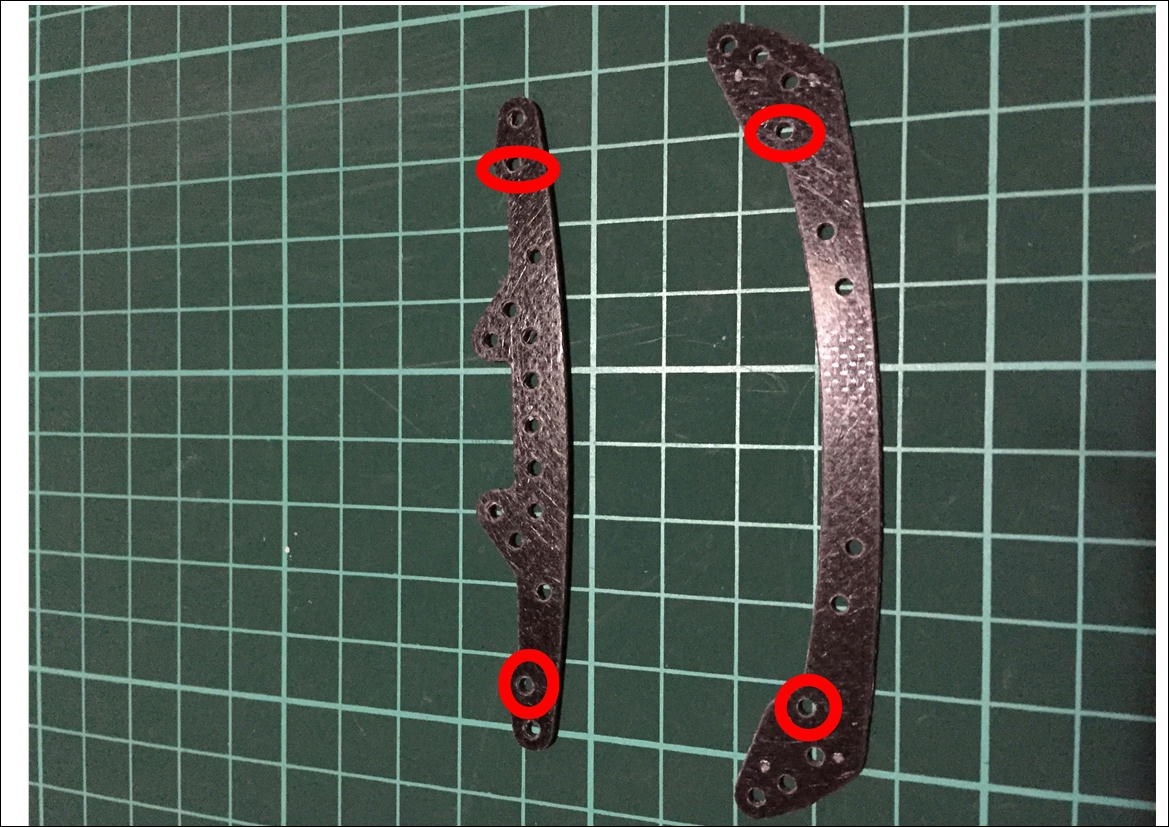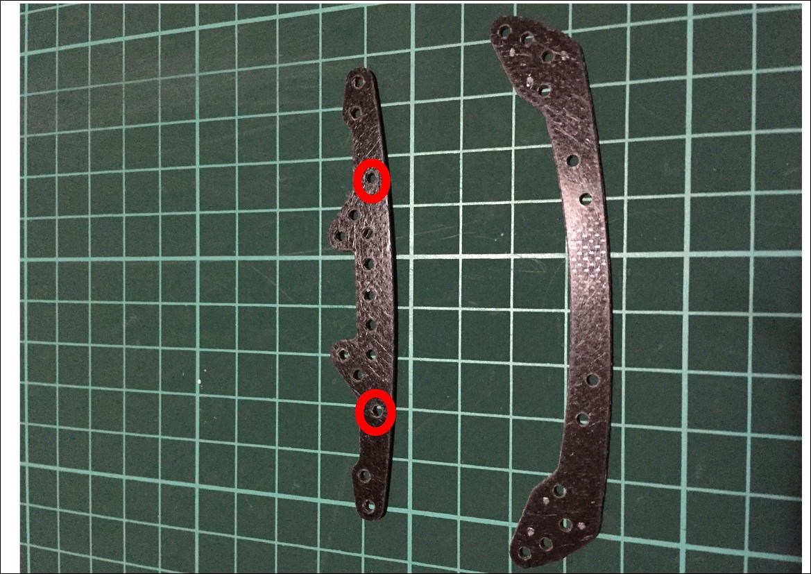 次に、稼働調整用のビスを左のプレートの赤丸の穴にナットで固定します。