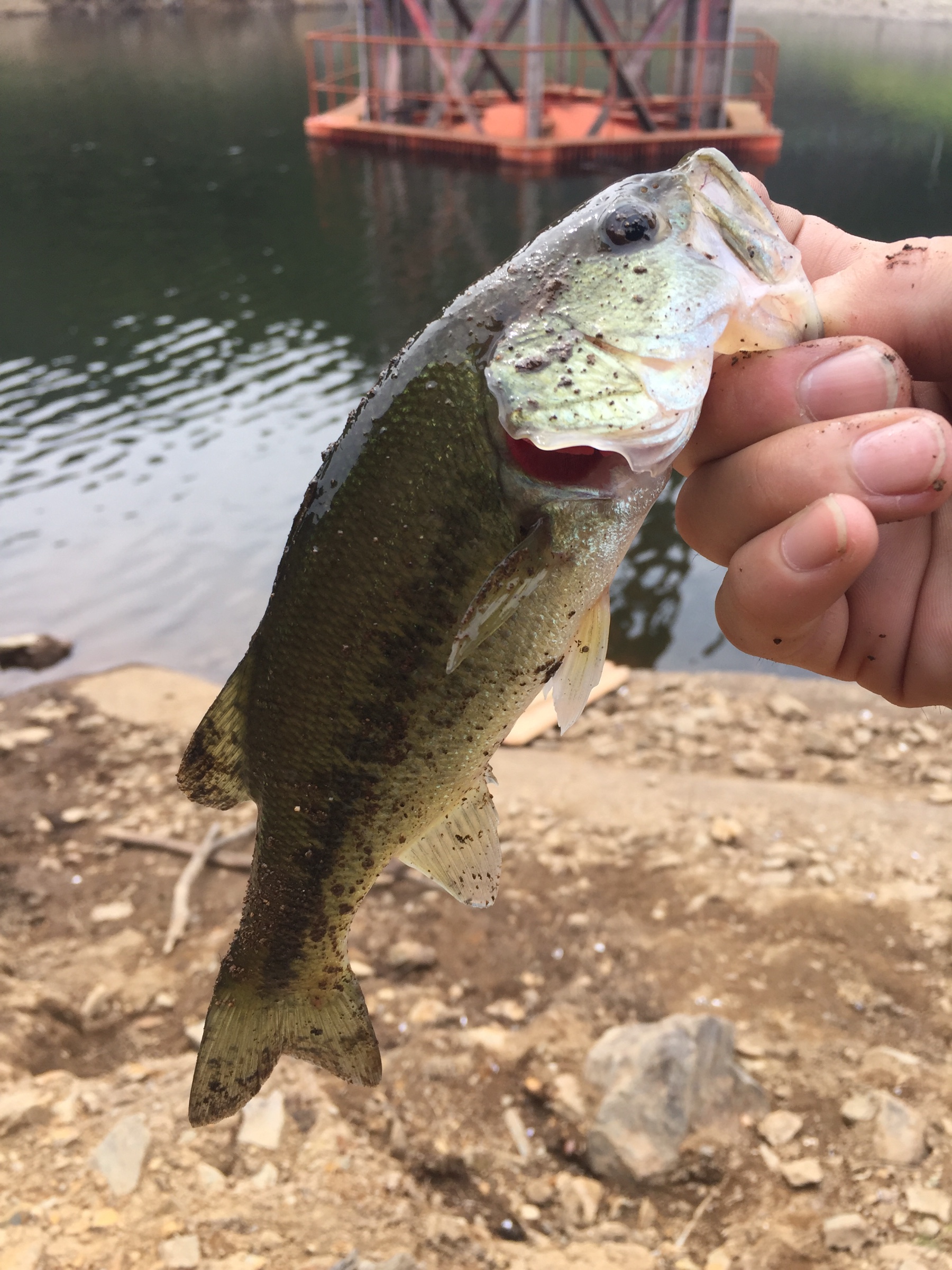 足元にいる稚魚を狙って比較的浅いところにバスがいることに気付きルアーをサイズダウンし場所を移動しながら釣りを続け2回のフッキングミスの後に2匹目。