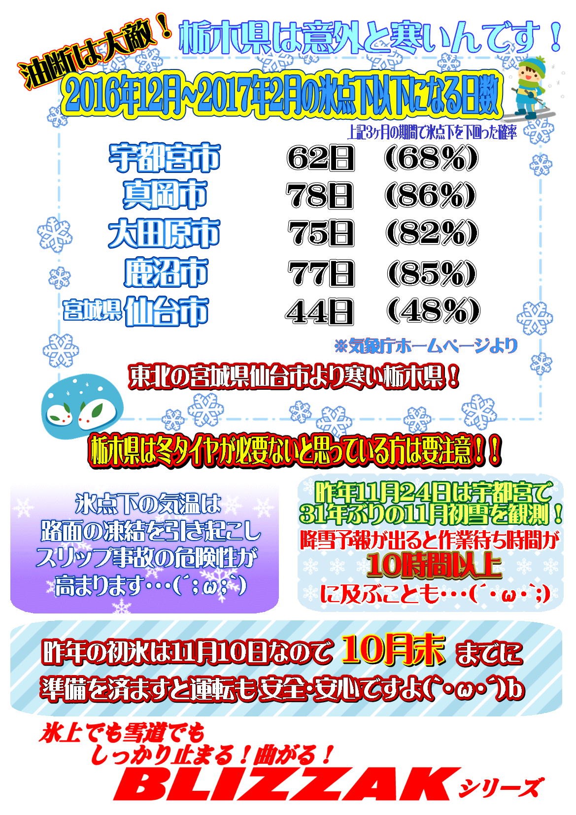 栃木県は降雪こそ少ないですが、氷点下日数が多く