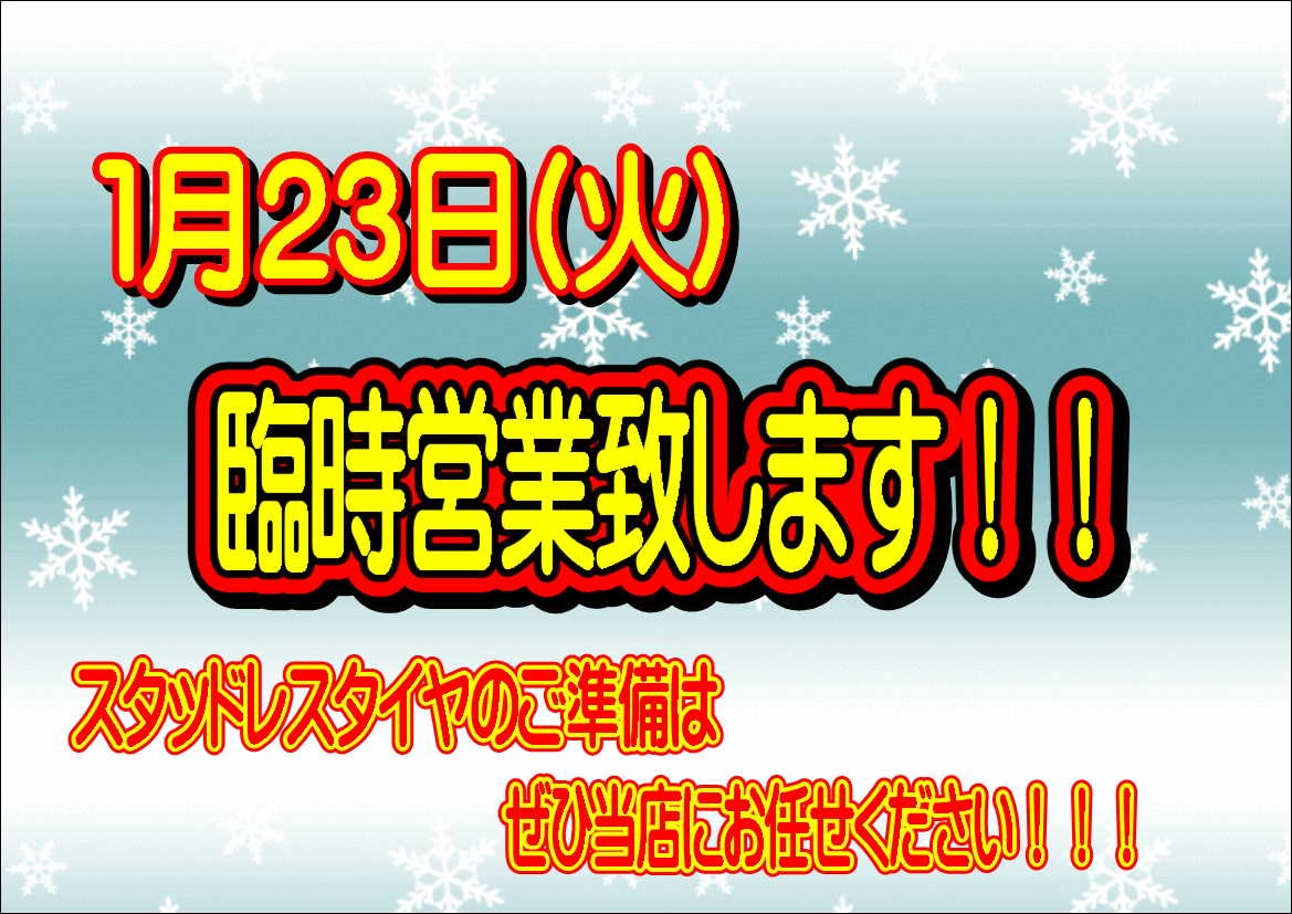 1月23日(火)臨時営業致します!!! ポスト 2018年1月22日 皆様こんにちは!! 降雪で徐々に町並みが白くなりつつありますね。 当店火曜日は通常ですと定休日となりますが お客様の安全を考え少しでもお役にたてばと思い・・・・ 1月23日(火)臨時営業致します。 ご来店の際には道路状況が悪くなっていると思いますので 安全運転でのご来店お待ちしております。