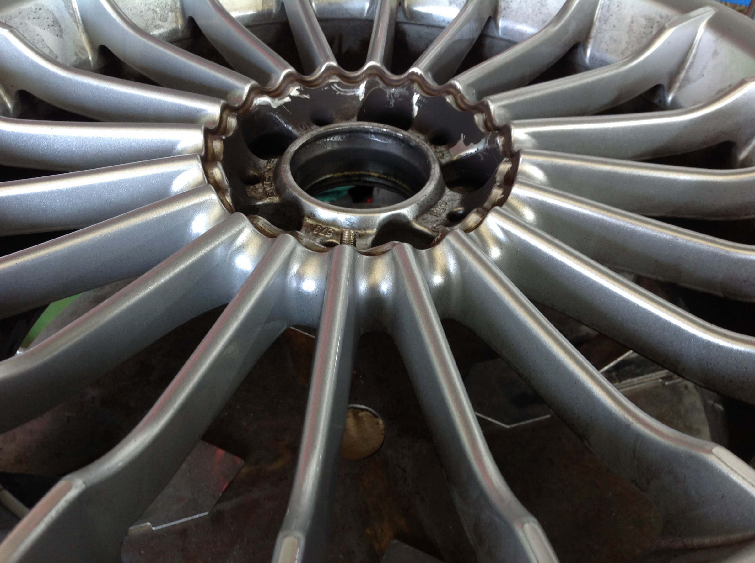 タイヤチェンジャーに作業途中のホイール。