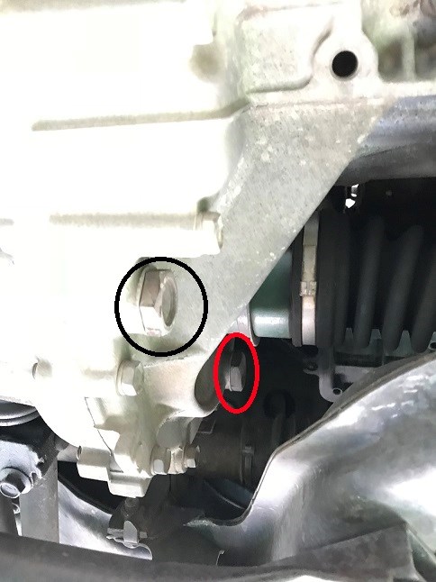 黒丸のボルトからオイルを抜き、赤丸のボルトから新油を入れていきます。