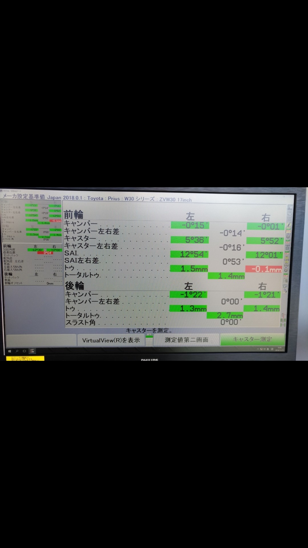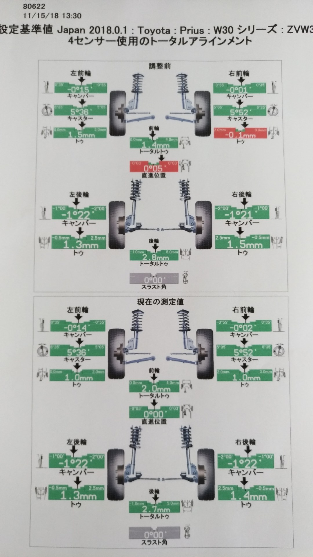 全体的にはそこまで基準値からは大きなズレは無いですが右のフロントのトーが基準値からズレていますね。