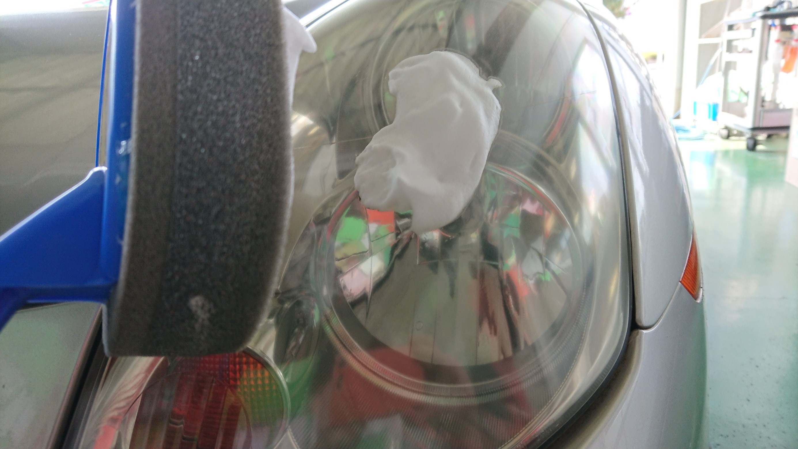 特殊な泡を使って、ヘッドライトの黄ばみを落としていきます。