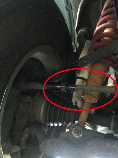 中央に見えるボルトナットをなめないように緩めてから右から伸びてきてるタイロットを動かして調整していきます。