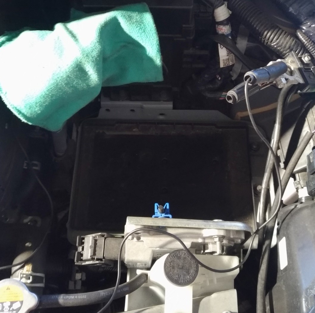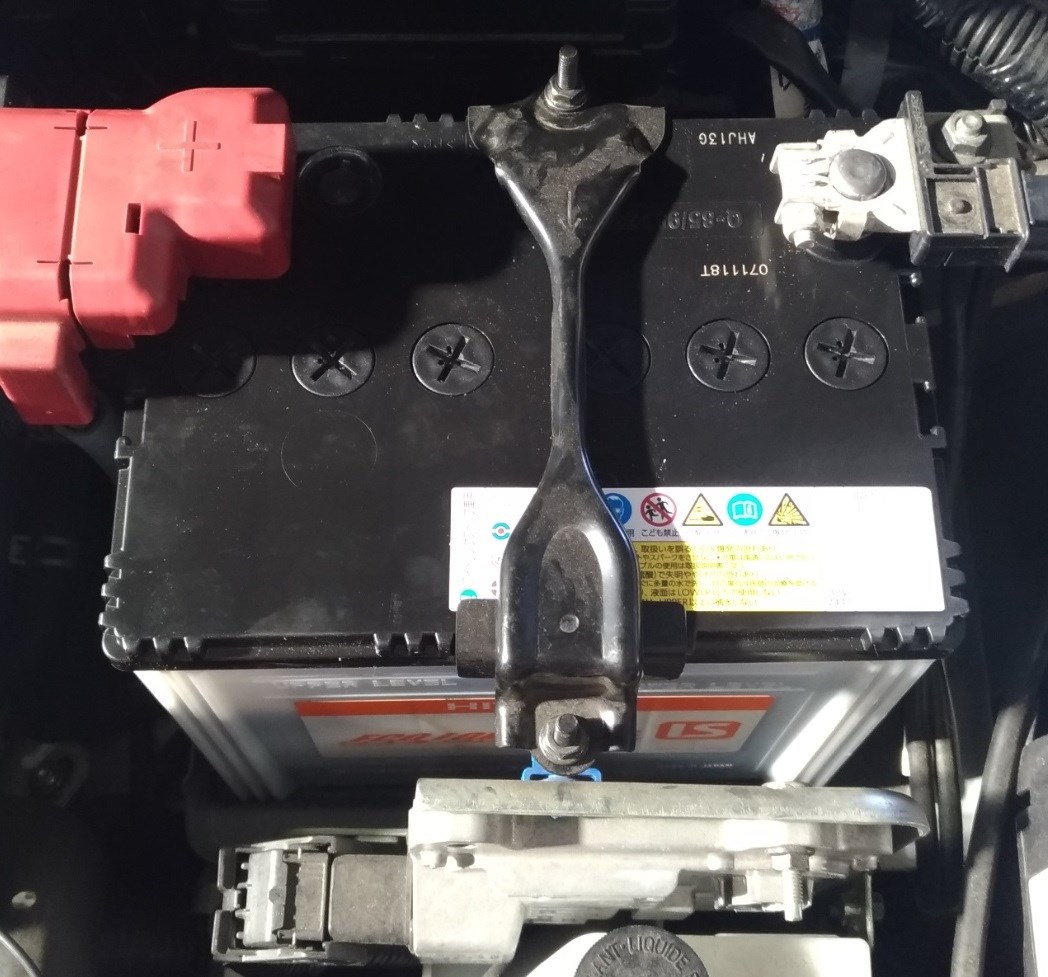 新しいバッテリーを入れて今度はプラスからマイナスの順にクランプを取り付けステイを取り付けて交換終了になります。