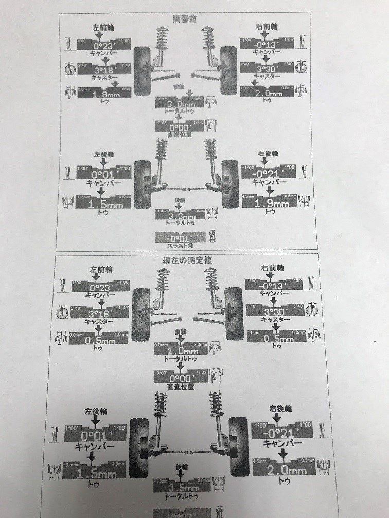 上の調整前の数値を見るとフロントのトゥが基準値が1.0mmなのに対して、今回は3.8mm内側に入ってしまってます。