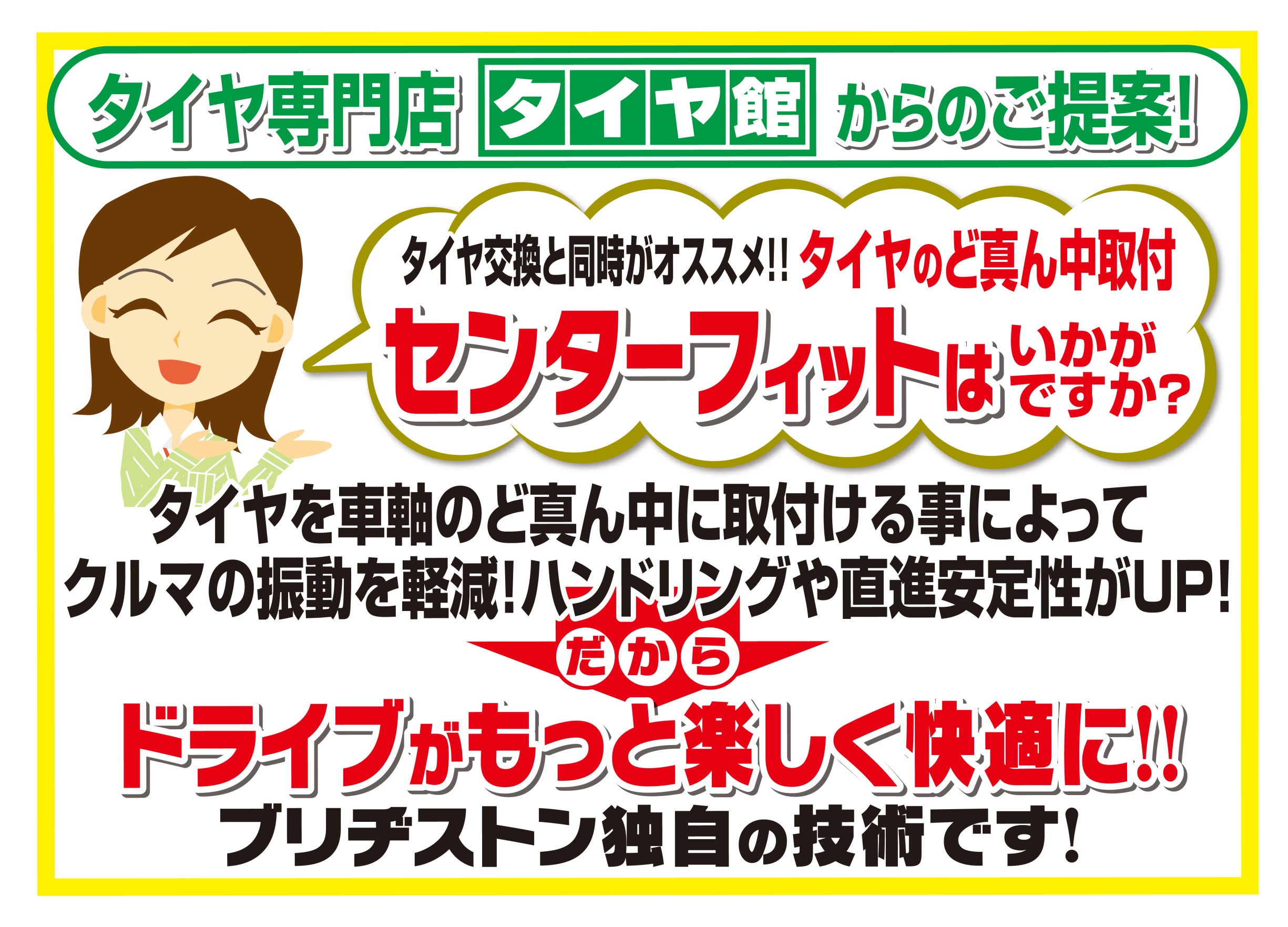 ドライブを快適に! ポスト 2019年1月14日 こんにちは!社員Yです! 今回はドライブをより快適にしてくれる作業をご紹介します! それがこちらのセンターフィットサービスです! このセンターフィットサービスはブリヂストンの独自の技術となっており、特殊な機械でタイヤに振動を与え タイヤを車軸のど真ん中に取り付ける作業になります!! 是非タイヤ館真岡店でタイヤど真ん中取り付けセンターフィットをして 今よりも快適なドライブを楽しみませんか? 皆様のご来店お待ちしております!! 担当:社員Y