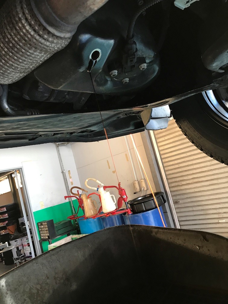まずエンジンルームを開けてキャップとゲージを緩めます。