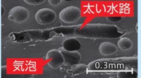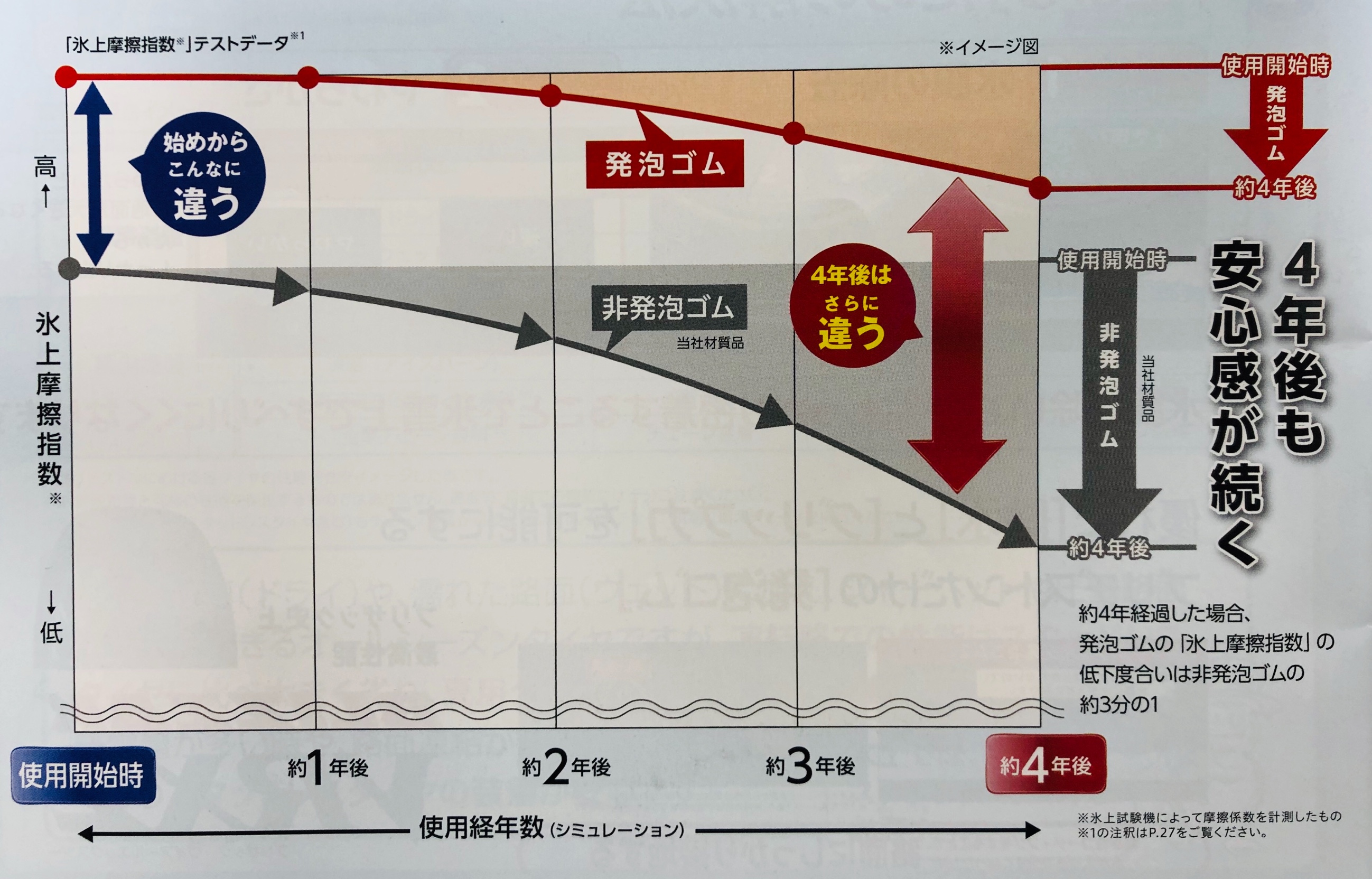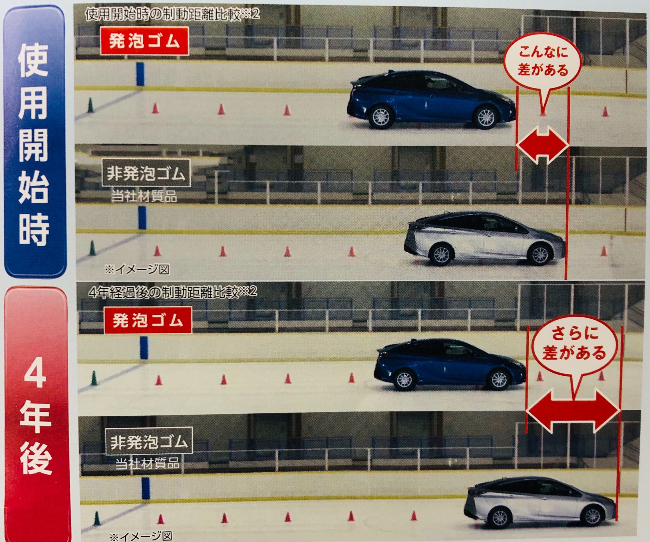 ゴムに特殊なオイルを混入する方法とは違い、発泡ゴムはすり減ってもタイヤ表面に新しい気泡と水路が現れるので、優れた効きが長持ちするんです!