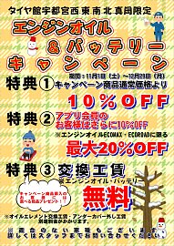 こんにちは! いつもタイヤ館真岡店をご利用いただきありがとうございます! タイヤ館真岡店では11月12月エンジンオイル・バッテリーキャンペーン実施中です! お得に交換できるこの機会にぜひご利用ください!! 皆様のご来店お待ちしております(^▽^)/