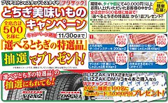 こんにちは! 星です! 9/15から11/30まで開催しております、 とちぎ美味いものキャンペーンですが、 本日最終日となっております! 期間中、ブリヂストンのスタッドレスタイヤ 40,000円(税込)以上お買い上げいただいた お客様の中から、抽選で 『選べるとちぎの特選品』1品プレゼン...