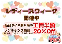 こんにちは✌ 本日はレディースDAYです!!!! ①新品タイヤ交換時の作業工賃が半額!! ②メンテナンス用品が通常価格より20%OFF!(ワイパー・オイル など) タイヤ交換もタイヤ以外もお得となっています! 男性の方も女性の方と一緒にご来店で特典が受けれます!! ご来店お待ちしております<(_...