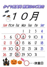 いつもタイヤ館真岡をご利用いただきありがとうございます。 10月の店休日を下記の通りお知らせいたします。 火曜日 定休日 10月8日(水) 臨時休業 ご利用のお客様におかれましては、ご不便をおかけいたしますが ご理解のほどよろしくお願いいたします。 大好評開催中のスーパータイヤセールですが1...