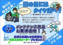 梅雨開けしてるのに本日も雨ですねー(>_<) ただ!雨が降ればあのキャンペーンが始まります!! そう!雨の日限定で行われる「雨も愉快だキャンペーン」です!! 通常よりオイル、バッテリー、ミッションオイル、ワイパー、エアコンフィルターなどのメンテナンス用品が お買い得になります!! さら...