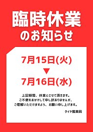 いつもタイヤ館真岡をご利用いただき誠にありがとうございます。 下記日程で定休日および臨時休業をいただきます。 7月15日(火) 定休日 7月16日(水) 臨時休業 休業中はご不便ご迷惑をお掛け致しますがご了承のほどお願いいたします。 なお7月17日(木) 10時から通常営業となりますので 皆様のご来店...