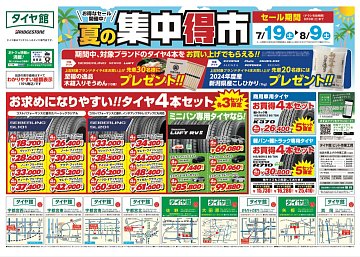 いつもタイヤ館真岡をご利用いただき誠にありがとうございます。 本日は今週末から開催される夏の集中得市のお知らせです。 セール期間およびチラシ有効期間は7月19日(土)から8月9日(土)までです。 セール期間中に対象ブランドのタイヤを4本ご購入でもらえるプレゼント 至福の逸品木箱入りそうめん(...
