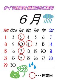皆様こんにちは!!! 本日は6月分の営業日をお知らせいたします。 6月11日(水)は臨時休業となりますので予めご了承ください。 雨が多くなる季節、タイヤのミゾは雨の日にしっかり曲がり止まるためにとても重要です。 雨の日運転の必需品!ワイパーも6月末までお得に交換できるセール開催中 ぜひ気...