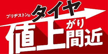 夏タイヤ値上がりまでもうすぐ!! 夏タイヤ値上がり前の購入でお財布に優しく 値上げ後は6~8%上昇の価格になるため、 ご検討のタイヤやサイズによっては 値上がり幅が大きくなってしまいます。 本日含めあと2日です! 夏タイヤ購入ご検討の方は今ですよ!