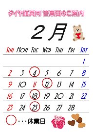いつもタイヤ館真岡をご利用いただきありがとうございます。 2月の店休日を下記の通りお知らせいたします。 火曜日 定休日【2月11日(火)は祝日のため臨時営業】 2月12日(水) 臨時休業 ご利用のお客様におかれましては、ご不便をおかけいたしますが ご理解のほどよろしくお願いいたします。