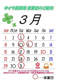 いつもタイヤ館真岡をご利用いただきありがとうございます。 3月の店休日を下記の通りお知らせいたします。 火曜日 定休日 3月11日(水) 臨時休業 ご利用のお客様におかれましては、ご不便をおかけいたしますが ご理解のほどよろしくお願いいたします。 花粉もちょこちょこ飛び始めて花粉症の...
