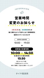 いつもタイヤ館真岡をご利用いただき誠にありがとうございます。 3月9日(月)は社内研修のため、 誠に勝手ながら下記の営業時間へ変更させていただきます。 なお3月10日(火)は定休日 3月11日(水)は臨時休業となりますので ご理解ご協力の程よろしくお願いいたします。