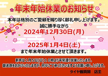 こんにちは! 星です! いつもタイヤ館真岡店をご利用頂き、ありがとうございます。 本日、2024年最後の営業日となります! スタッドレスタイヤへの履き替えがまだお済みでない方、本日お待ちしてますよ! 今年も沢山のお客様にご来店いただき、誠にありがとうございました。 2025年もスタッフ一同...