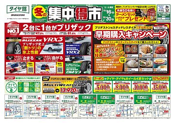 お得なセール期間 まもなく終了です 冬の「集中得市」は11月30日(土)まで開催中。 ブリヂストンのスタッドレスタイヤがお得に買える期間が 本日含めあと3日となりました。 お買い得なスタッドレスタイヤとアルミホイールの 4本セット販売や、オールシーズンタイヤ等の お問い合わせもお待ちしてお...