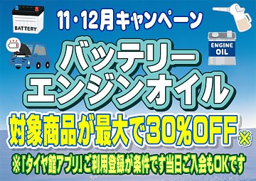 タイヤ館真岡をご利用いただきありがとうございます。 今月のお得な情報をお知らせいたします。 エンジンオイル 対象商品「エコマックス」、「エコロード」が通常価格より20%OFFに! さらに「タイヤ館アプリ」ご登録で、割引率が30%になります! バッテリー 対象商品「エコロングセーブIS」、...