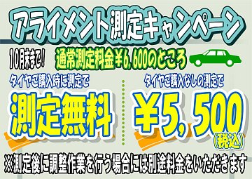 いつもタイヤ館真岡をご利用いただき ありがとうございます。 現在当店では「アライメントキャンペーン」を 10月末まで実施しております。 内容は以下の画像の通りとなります↓ アライメントとはタイヤの取り付け角度のことで、通常走行しているだけで徐々にずれが生じていきます。 ハンドル位置の...