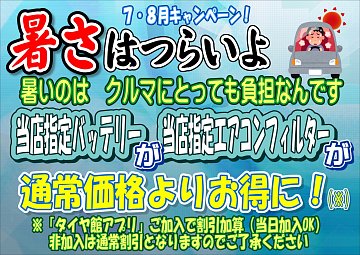 夏のクルマはとってもお疲れ・・・ これからの季節、夏休みや長期連休で 行楽や帰省などでクルマを使用する機会が 多くなると思います。 お出掛け前のメンテナンスをしっかりと! バッテリーはクルマを始動させるための もっとも重要な部品です。そんな中、 バッテリーあがりで走行不能になる トラ...