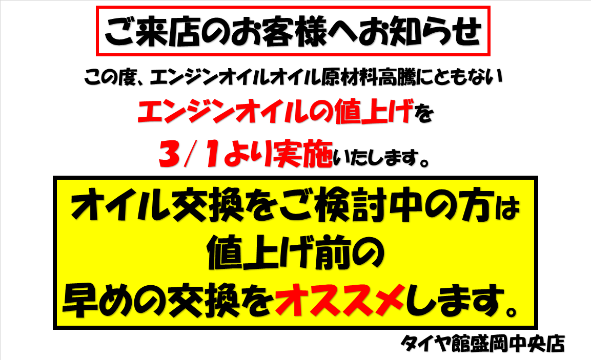 オイル値上げ ポスト 2023年2月14日 度々 値上げのお知らせ。 心が痛い。 申し訳ございません。 実は 2月に仕入れした分のオイルが すでに値上がりしております。 ですが 2月は据え置き価格。 これにともなって 毎週月曜日のレディースデイ 女性のお客様限定価格も 値上がりします。 ご予定の方は 2月中の交換をオススメします。 お待ちしております。 m(__)m カテゴリ:お知らせ