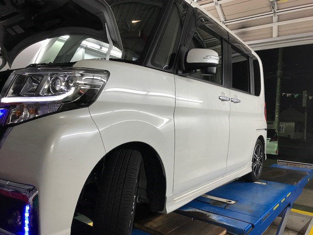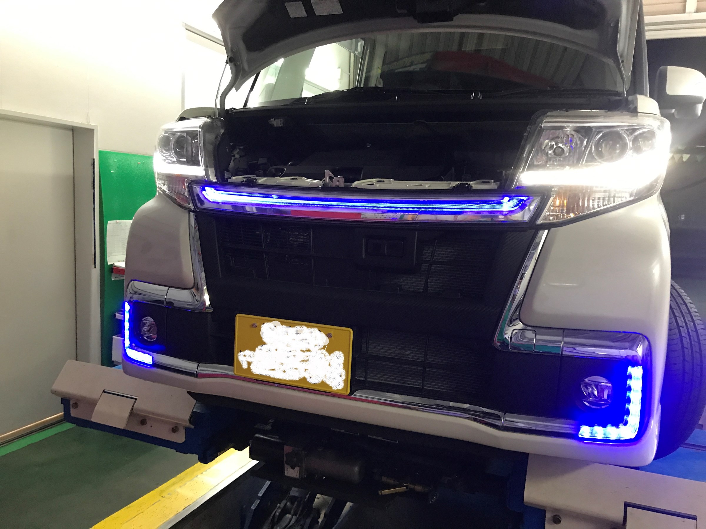 タント フロントイルミ サス交換 ポスト 2017年4月25日 本日のお客様は フロントに純正イルミとテインS・TECHをご購入のお客様です 青に輝いてる所が交換した所です グリルはただのメッキグリルでしたが、そこに青のラインが追加 車高も適度にダウン 今回はS・TEHCをチョイス これなら女性でも安心して乗って頂けます この後アライメントで終了です 明日のお渡しが楽しみです 担当:吉田