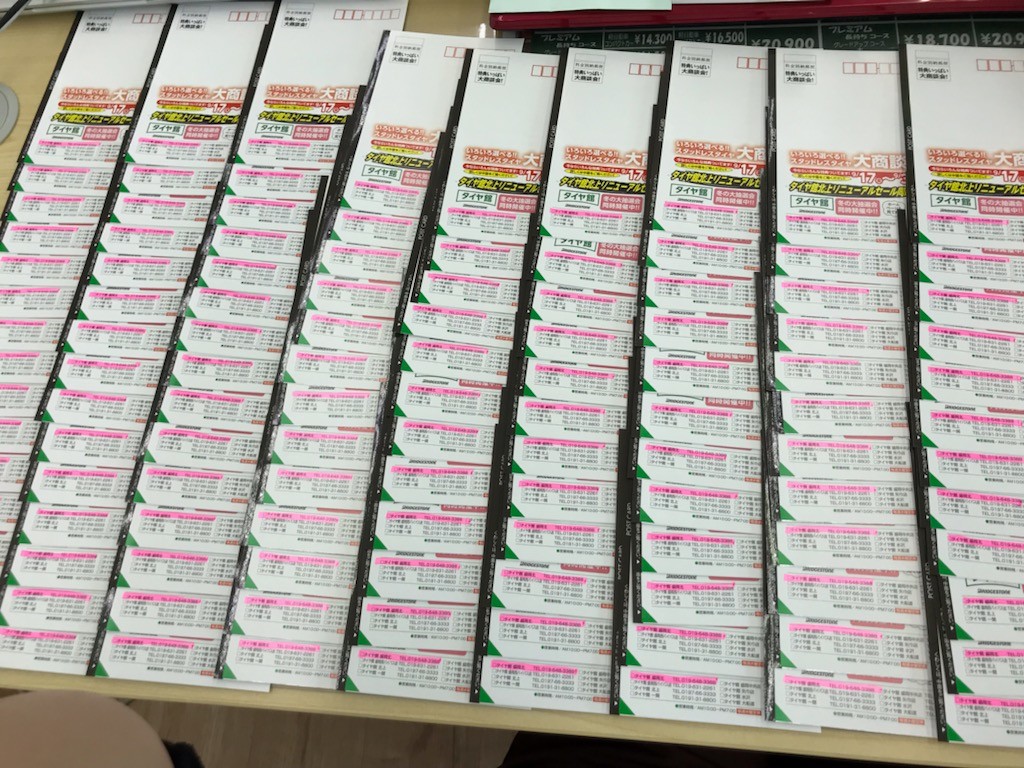 準備中 ~はがき~ ポスト 2021年9月10日 皆さんこんにちは! 17日(金)より開催予定の、 【スタッドレスタイヤ大商談会】開催に向けて・・・ いろいろ準備中ですよ٩( ''ω'' )و 今日はみんなで店内で黙々と。 いつも当店をご利用のお客様にはお葉書が届きますので、 是非ご覧になってご来店くださいネ(*´ω`*) お気軽にご相談ください(^^)/ ご来店お待ちしてます♪ 担当:蜂谷