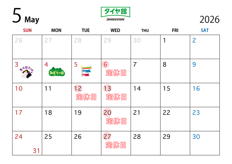 ☆5月の定休日について☆ ポスト 2026年4月30日 こんにちは!タイヤ館盛岡北です(^▽^)/ いつのまにか明日から5月...! やっと暖かくなってきて気分もあがりますね O(≧∇≦)O さて、本日のおしらせは 5月の定休日についてです! 5月も毎週水曜日、第二火曜日がお休みとなっております☆彡 来店の際はお間違えの無いよう よろしくお願いいたします! 担当:西舘=^・・^=