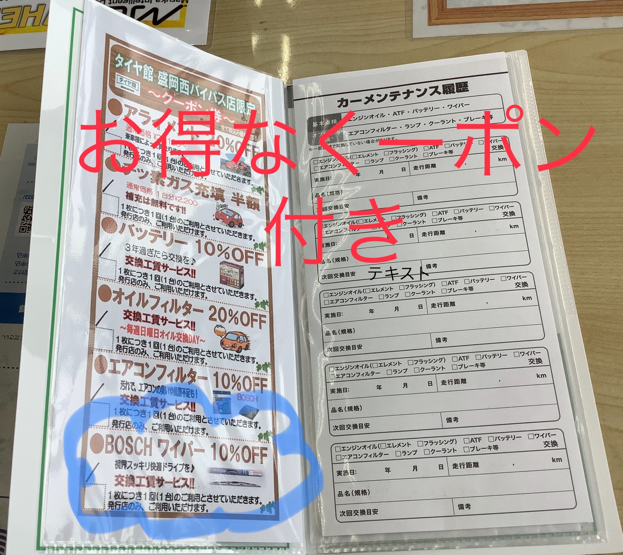 お得なクーポン付き、メンテナンスカード ポスト 2022年4月17日 メンテナンスセーフティパス こんにちは。 タイヤ館ご利用の方は、すでにお持ちかと思います。 メンテナンスセーフティパス。 略して、メンパス!! こちらのパスポート、お車のメンテナンス履歴が見れるもの。 さらに、お得なクーポン付き(´ω`) まだ一度も使用してない方、ぜひクーポン使って、 お得にメンテナンスしましょう。 ワイパー交換もいたします(o^^o)
