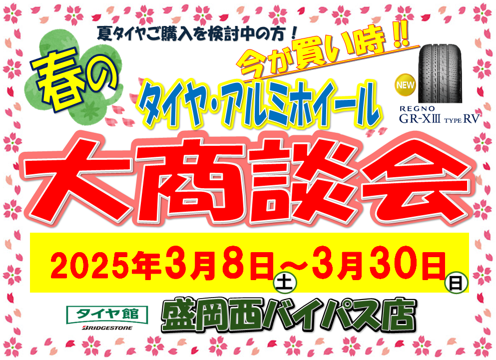 本日最終日‼️ ポスト 2025年3月30日 こんにちは。 3月も残り2日になりました。 春の大商談会、本日最終日となっております。 まだ、夏タイヤのご準備進んでない方、まだ間に合いますよ〜 ご来店、お待ちしております♪ タイヤ館 盛岡西バイパス店 住所:020-0851岩手県盛岡市向中野3丁目3-48 電話番号: 019-631-2261 カテゴリ:お知らせ 担当:長谷部