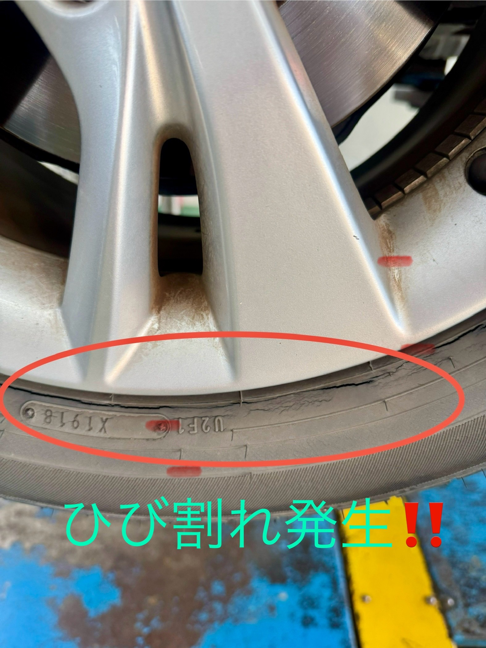 タイヤのひび割れは、空気圧不足、経年劣化、紫外線、走行頻度の少なさ、