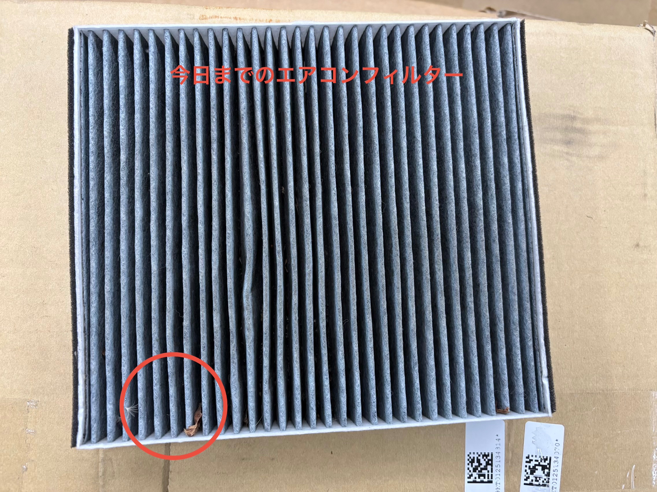 今日までのエアコンフィルターと新品エアコンフィルターの見比べはこの通り、年一回交換行っておりましたが枯葉やほこりが少し詰まっていました……定期交換は大事ですね