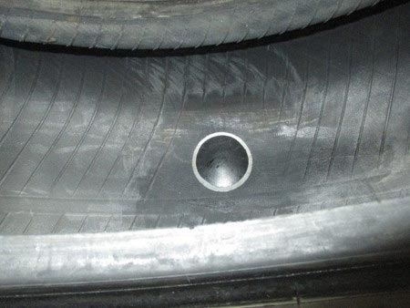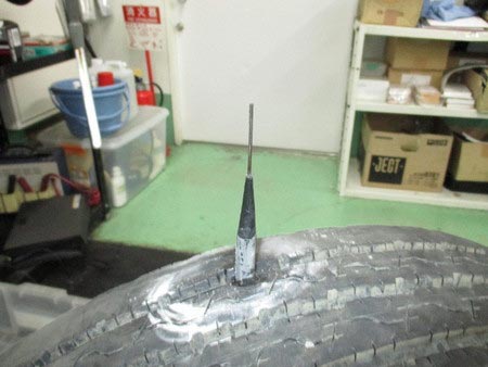 コレを使うことで、通常の外面からの修理よりもより安全で確実な修理が出来るんです(写真のタイヤの表面に出ている部分は最後に切り落とています)