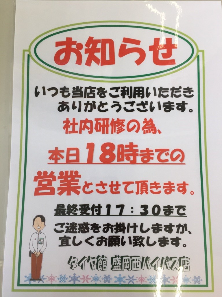 ~営業時間変更のお知らせ~ ポスト 2019年2月26日 誠に勝手ながら、本日社内研修の為・・・ 18時閉店とさせていただきます。 ご迷惑をお掛けしますが、 ご理解の程宜しくお願い致します。 ご来店お待ちしてます♪ 担当:スタッフ一同
