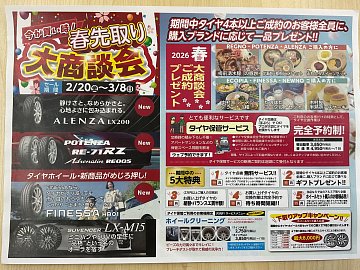 みなさんこんにちは! まだまだ寒いですが、 夏タイヤのご準備出来ていますか? ご使用してる夏タイヤ、 年数古く無いですか? ミゾ減って無いですか? 亀裂等入ってませんか? お持ちいただければ点検いたします! そんな方へ!セール情報! 春先取り!大商談会!を開催いたします! 期間は、2/20(...