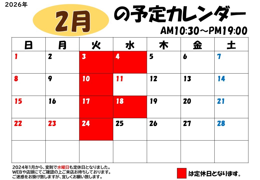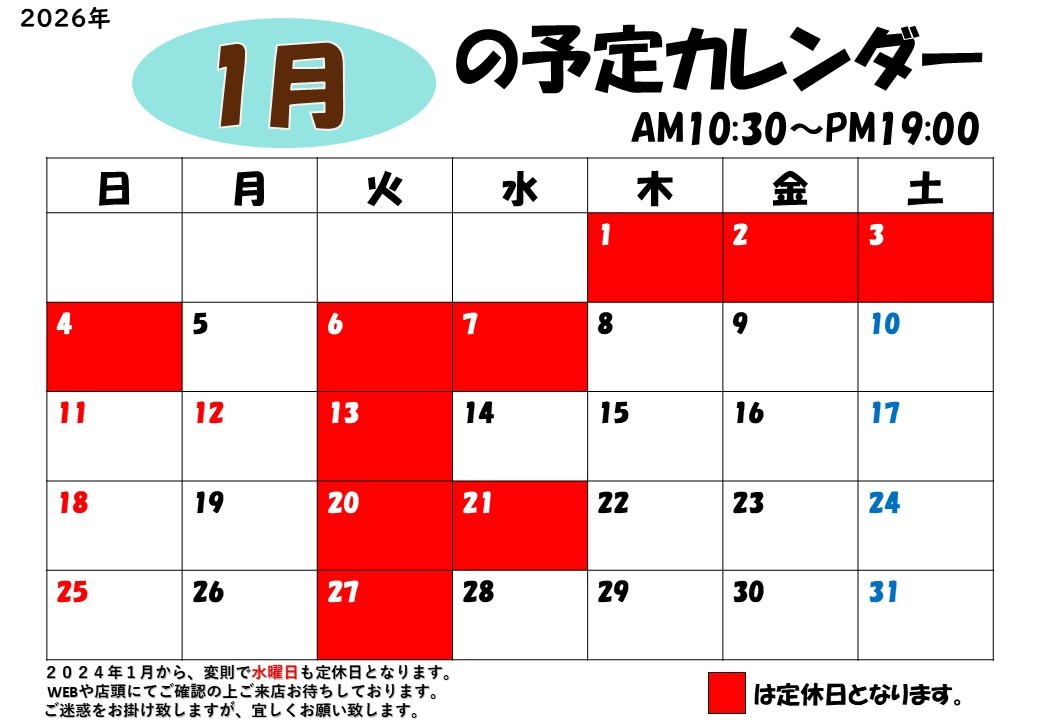 ★1月27日(火)は定休日です★