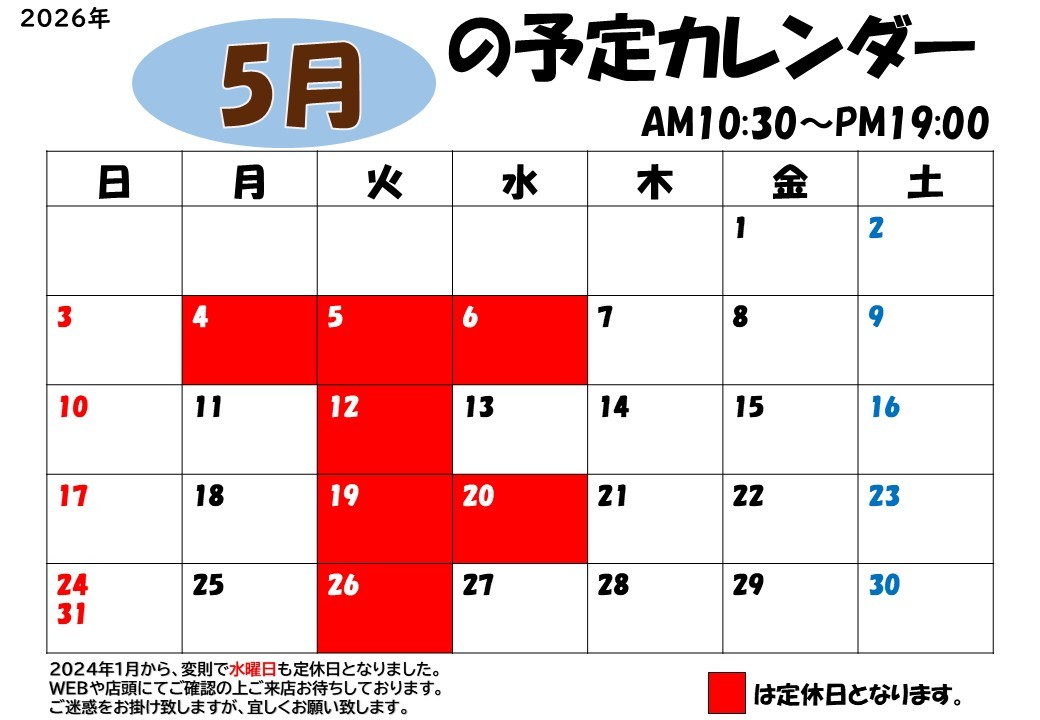 ■■■2026年5月定休日のご案内■■■