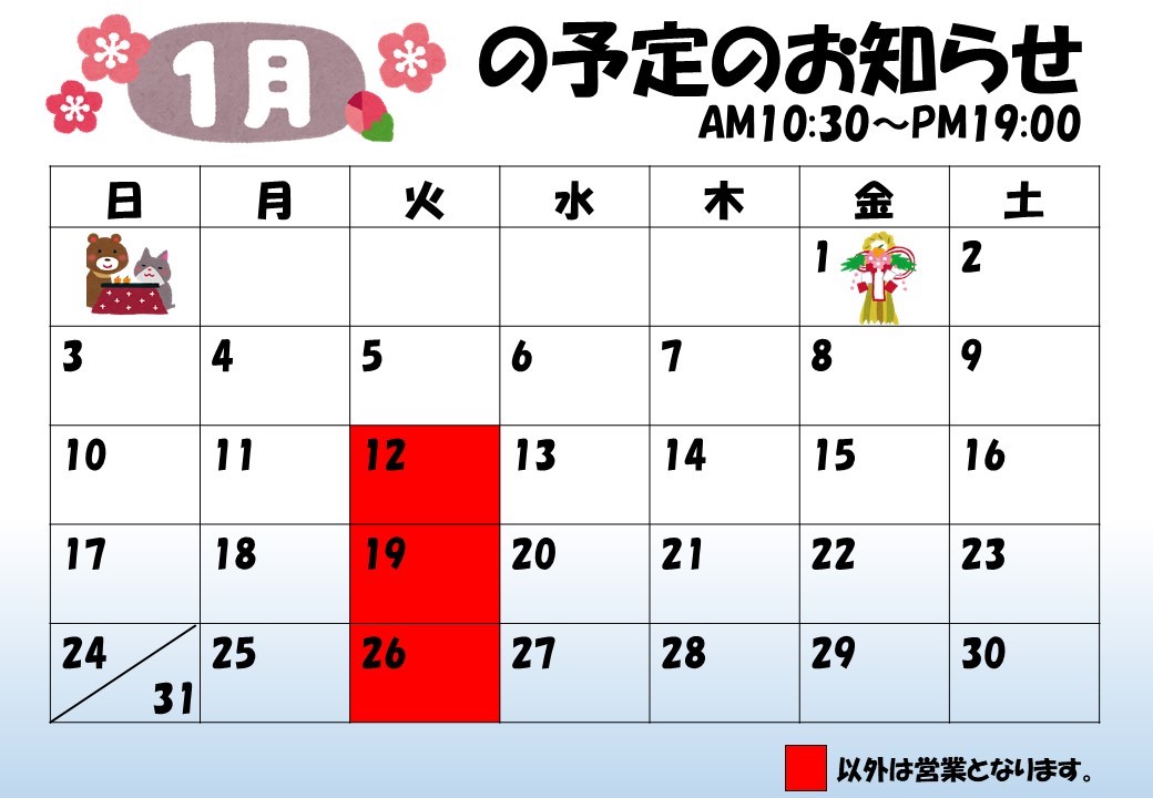 1月は12日、19日、26日は定休日となります!