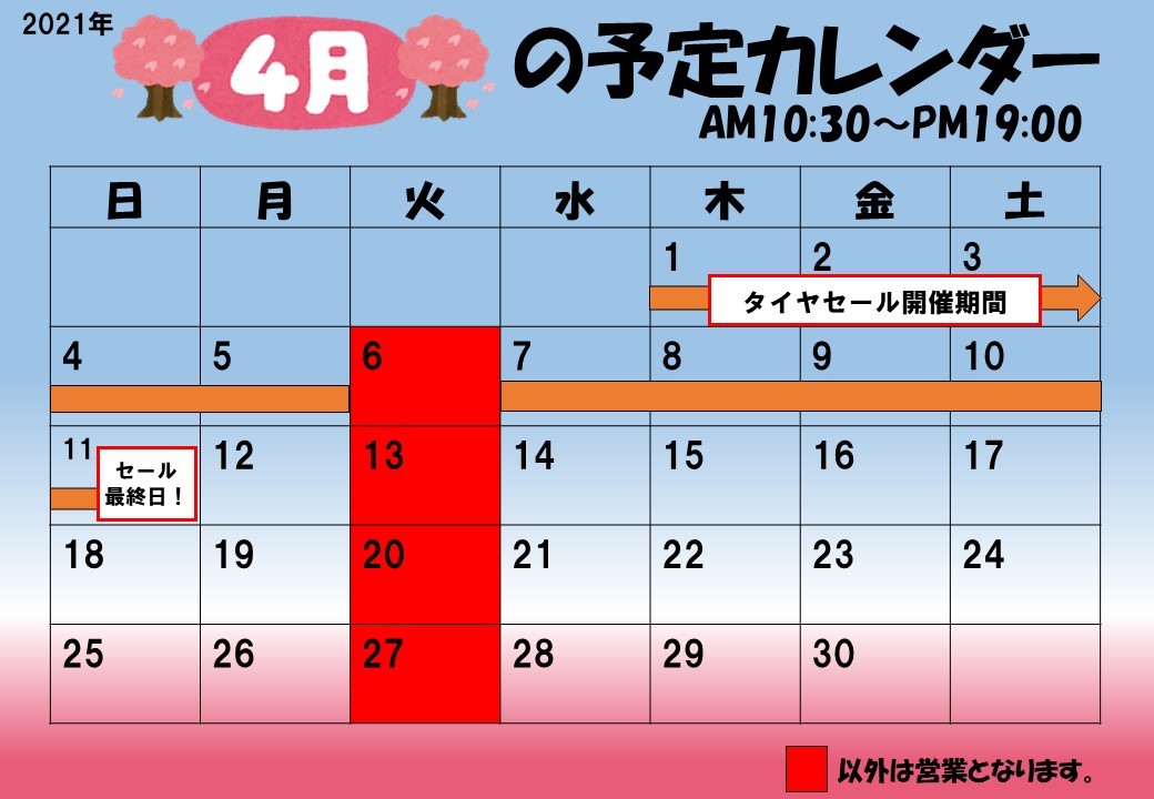 4月定休日のお知らせ ポスト 2021年3月31日 こんにちは! ゆあさです! 本日は良い天気ですね! さて、皆様明日から4月ですね! 4月の定休日のお知らせを致します! 明日はエイプリルフールです!(笑) 4月は火曜日が定休日となります! 営業時間は10:30より営業しております(#^^#) タイヤ館守山では4/11までタイヤセール開催中です! 是非皆様、ご来店ください! 担当:ゆあさ