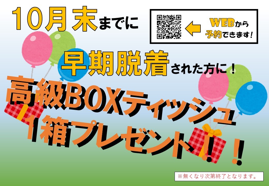 10月末までの脱着で、ティッシュ1箱プレゼント!