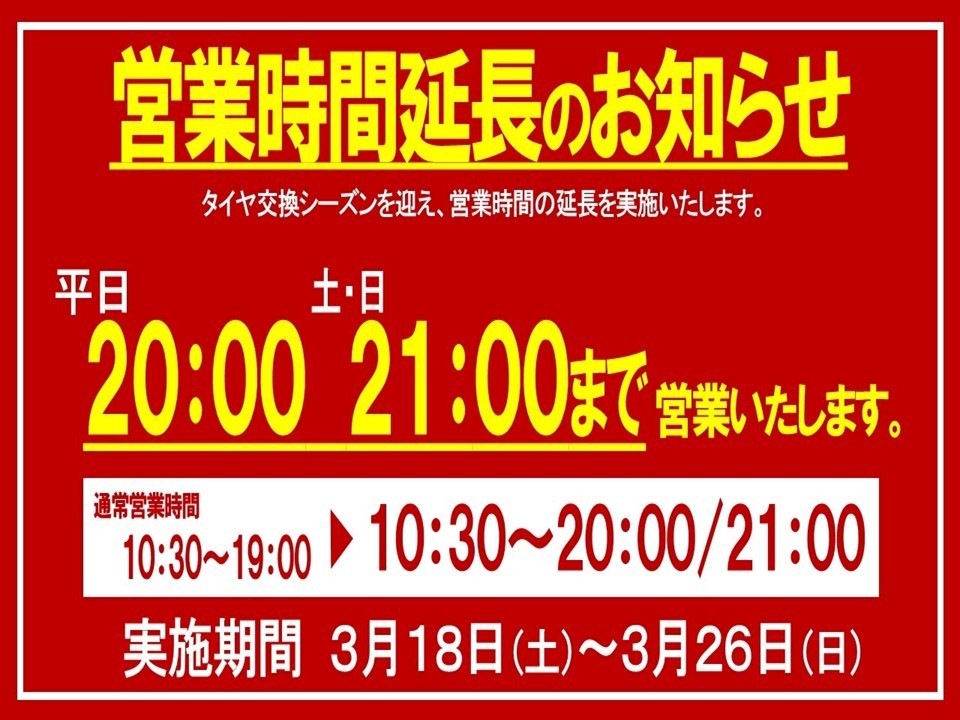 延長営業のお知らせ ポスト 2023年3月19日 いつもタイヤ館守山をご利用頂き誠にありがとうございます。 当店では繁忙期に合わせた 3/18(土)~3/26(日)まで 営業時間の延長を実施致します。 予約の枠についても順次解放しておりますので ご確認の上ご予約ください。 延長時間は下記の通りとなります。 平日 10:30~20:00まで 土日 10:30~21:00まで なお、繁忙により ご希望のお時間でのご予約が 難しい場合もございます。 お早いめのご予約準備をお願いいたします。 タイヤ館守山 住所 〒524-0052 滋賀県守山市大門町28-1 電話番号 077-583-7567 定休日 火曜日 オイル/バッテリー/各種コーティング 輸入車作業/アライメント/足回り交換 車検/ワイパー/無料メンテナンス/等々 相談予約 タイヤ点検・安全点検/タイヤ履き替え/オイル交換/その他ピット作業の予約 担当:タイヤ館