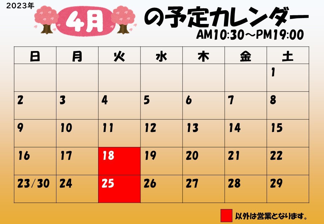 4月の定休日のお知らせになります。